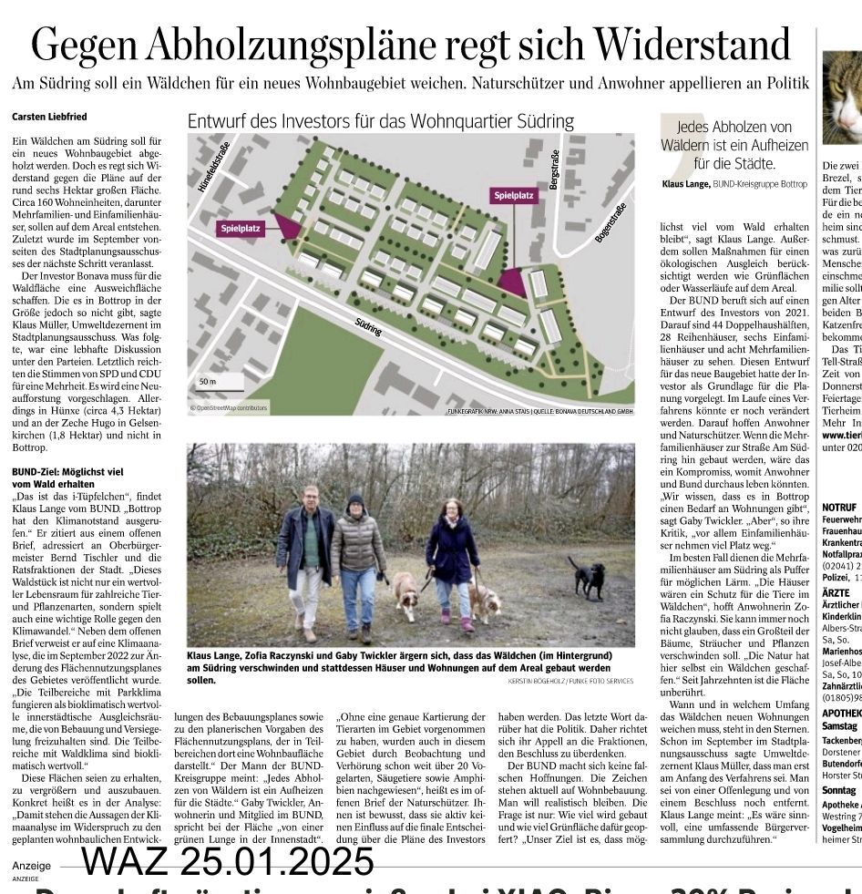 Treffen mit rund 60 AnwohnerInnen im Wäldchen am Südring, welches völlig bebaut werden soll. Es wurde ein offener Brief an OB Tischler und an die Ratsparteien verfasst, um deutlich zu machen, dass der Bebauungsplan abgelehnt wird, da klimaschädlich.